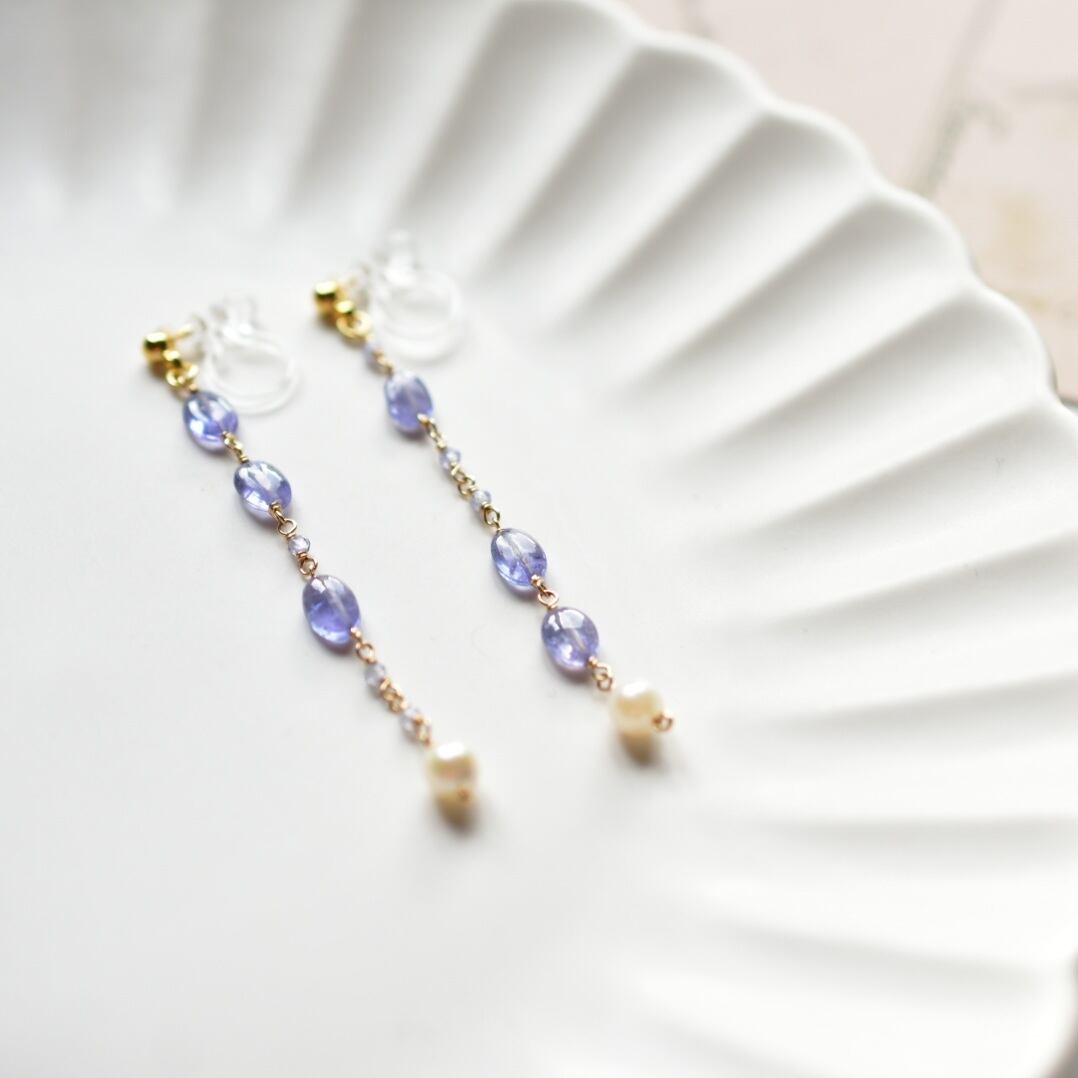 タンザナイトとベビーあこやを使用した、シンプルなノンホールピアス。