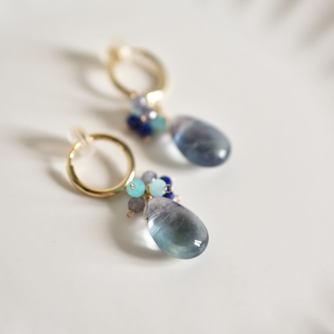 きれいな氷のようなブルーフローライトに、ブルー系の天然石を合わせた、涼し気なフープイヤリング。